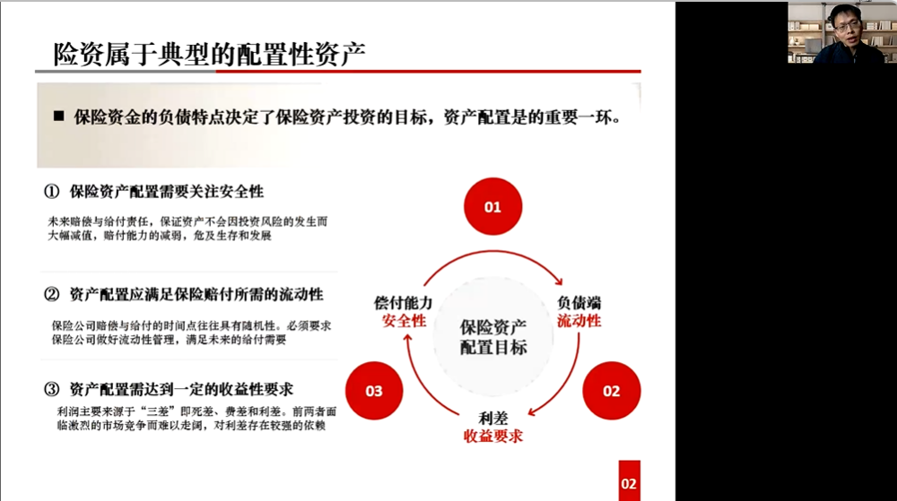 由保险资金的负债特点出发,曹云祥指出在保险经营的目标实现中,资产配置是非常重要的一环。首先保险资金需要关注安全性,也就是关注未来赔偿与给付责任,保证资产不会因投资风险的发生而大幅减值,导致赔付能力的减弱而危及保险公司生存和发展;其次资产配置应满足保险赔付所需的流动性,因为保险公司赔偿与给付的时间点往往具有随机性,必须要求保险公司做好流动性管理,满足来来的给付需要;最后资产配置需达到一定的收益性要求,保险公司利润主要来源于“三差"—死差,费差和利差,从我国寿险业来看,死差和利差面临激烈的市场竞争而难以走阔,利润来源较强的依赖利差贡献。基于此,曹云祥认为为实现保险投资的目标,应该坚持三大主要原则,收益匹配原则,久期匹配原则,“三性兼顾,安全第一”原则。 其中,“三性兼顾、安全第一”原则指收益性、流动性、安全性的恰当匹配,并且把风险管理放在首位。