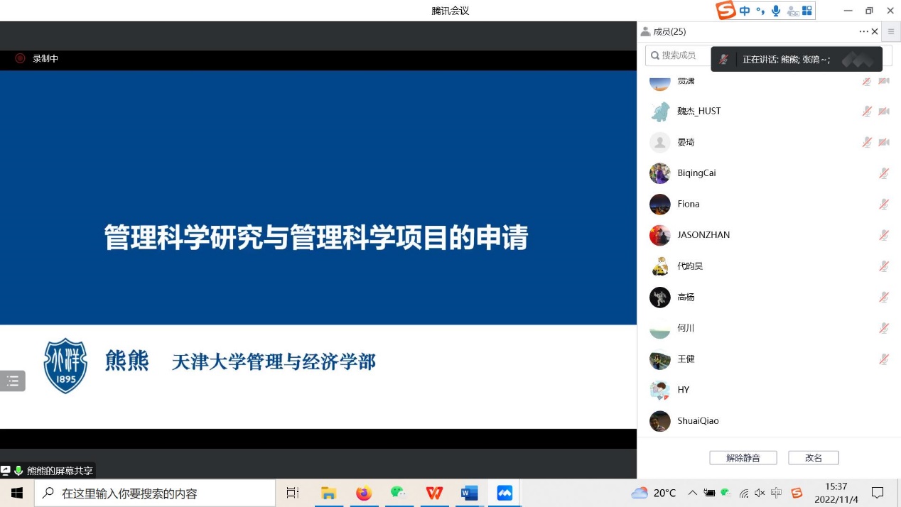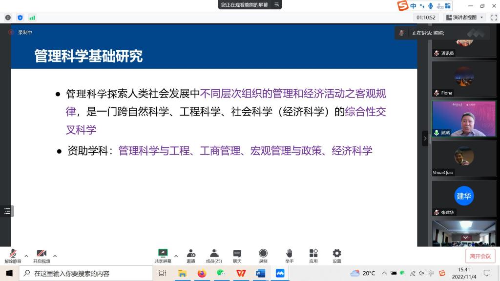 熊熊教授开展了以《管理科学研究与管理科学项目的申请》为题的分享。熊教授针对管理科学基础研究,管理科学的特点与基本规律,学科发展的现状、不足与制约展开了介绍;并指出了国家自然科学基金深化改革要点、管理科学的发展规律与发展态势、优先资助领域的布局。最后,熊教授对于管理科学基金的申请要点、步骤、案例进行了详细说明。
