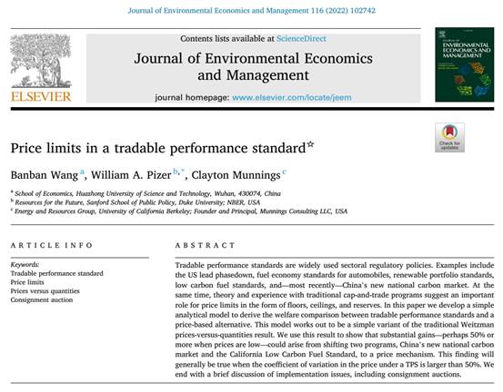 本网讯(通讯员 张鹃)王班班副教授和美国未来资源研究所(RFF)William A. Pizer教授、加州大学伯克利分校Clayton Munnings的合作研究成果“Price limits in a tradable performance standard”(可交易绩效标准中的价格限制)于2022年10月发表于环境经济学国际顶级期刊《Journal of Environmental Economics and Management》(《环境经济与管理杂志》)。