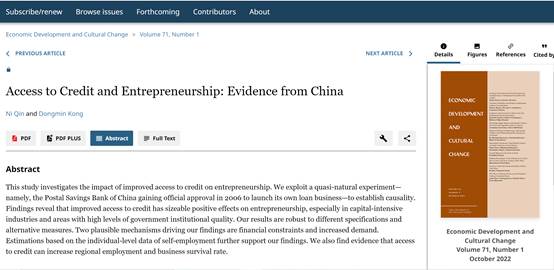 本网讯(通讯员张鹃)秦妮博士及孔东民教授合作研究成果“Access to Credit and Entrepreneurship: Evidence from China”(银行信贷可得性与企业家精神:中国经验)于2022年10月发表于发展经济学领域国际权威期刊《Economic Development and Cultural Change》(《经济发展与文化变革》)。