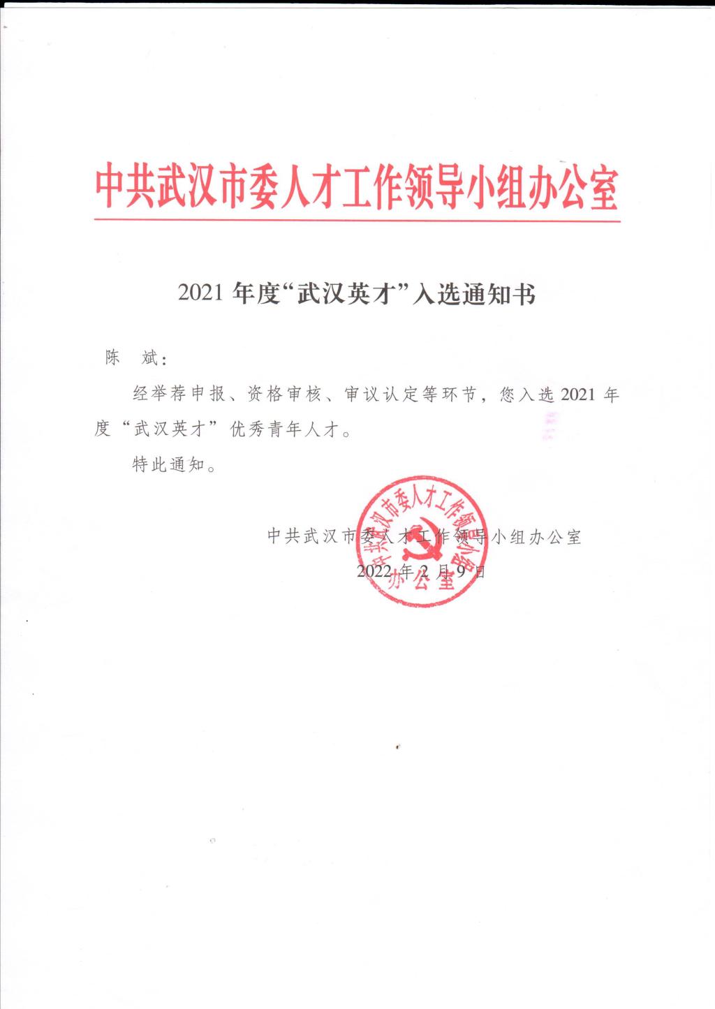 本网讯(通讯员 王彬)日前,武汉市组织部公示了2021年度“武汉英才”人选名单,公司陈斌教授入选。