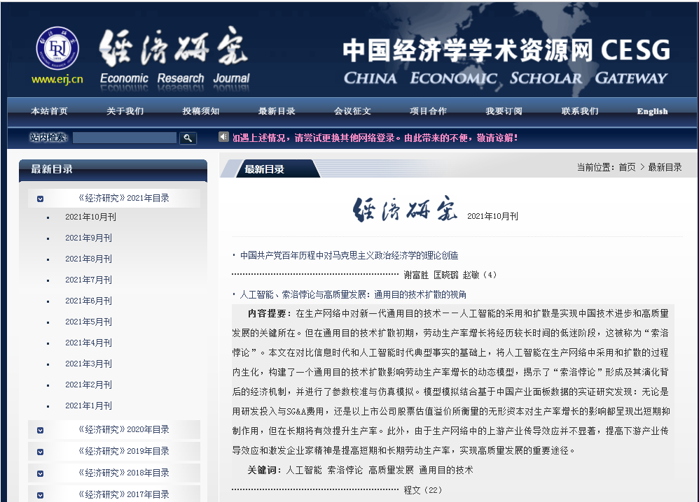 (通讯员 张鹃)日前获悉,程文副教授以独立撰稿人身份的最新研究成果“人工智能、索洛悖论与高质量发展——基于通用目的技术扩散的视角》在重点权威期刊《经济研究》(2021年第10期)刊登。