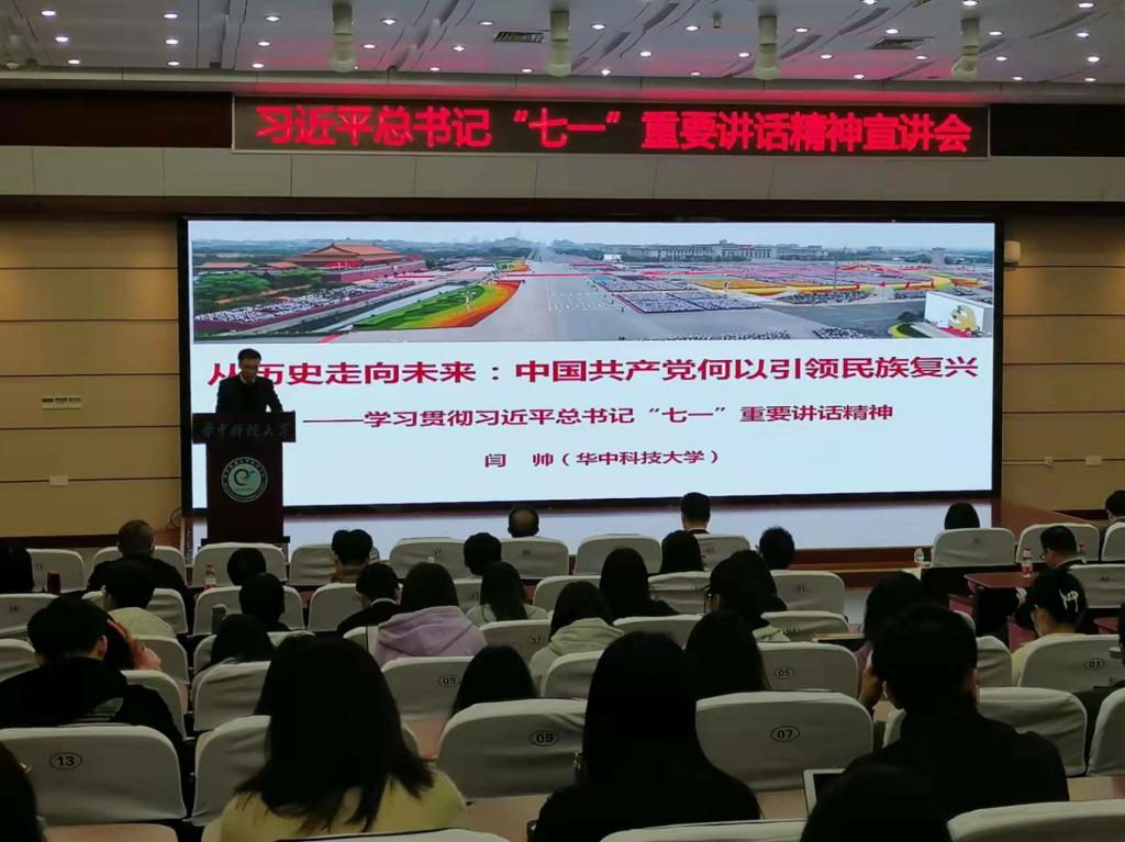 在这些伟大成就的背后,闫老师特别强调了中国共产党的领导地位,中国共产党能引领中国人民走向复兴的根本便在于它的顶天立地,在于伟大的建党精神。他着重讲解了“两弹一星”精神,并深情讲述了杨振宁先生与邓稼先先生之间“但愿人长久,千里共同途”的美好愿望。最后,闫帅老师以“实现第二个百年奋斗目标的新赶考论”作结,指明中国共产党时刻居安思危,时刻不忘人民,并一直带领人民走在实现民族复兴的路上。