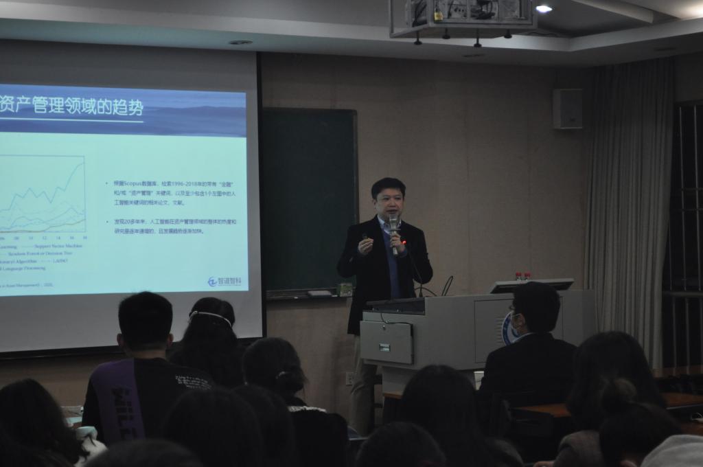本网讯(通讯员范乐怡)2021年11月5日晚上,金融市场发展前沿系列讲座(四十八)期讲座在永利3044noc103教室顺利举行。本次讲座邀请智道智慧科技(深圳)有限公司董事长彭聪担任主讲嘉宾,他以“人工智能在资产管理领域的应用场景”为主题进行了演讲。永利3044noc金融学系张学功老师担任本场点评嘉宾。