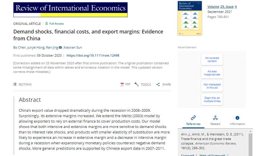 本网讯(通讯员张鹃)公司陈波教授与其合作者在国际知名期刊《国际经济学评论》(ReviewofInternationalEconomics)上发表题为“Demand shocks, financial costs, and export margins: Evidence from China”(需求冲击、融资成本和出口边际:来自中国的证据)的研究论文。