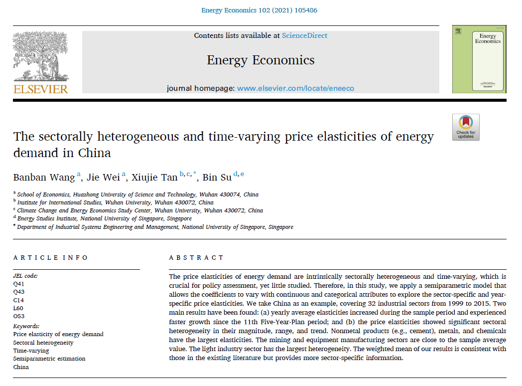 (通讯员 张鹃)近日,永利3044noc王班班副教授(第一作者)、魏杰副教授(第二作者)在国际知名期刊《Energy Economics》上发表最新研究论文。该论文题为“The sectorally heterogeneous and time-varying price elasticities of energy demand in China”(行业异质性和时变性的中国能源需求价格弹性),系与武汉大学谭秀杰副教授(通讯作者)、新加坡能源研究所苏斌研究员的合作研究成果。
