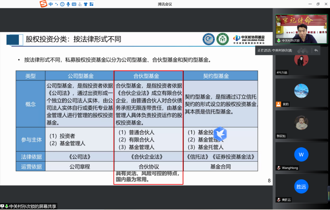 讲座伊始,孙次锁首先介绍了常见的投资种类,并按照股权投资是否上市、股权投资法律形式不同、股权投资募集方式不同以及股权投资资金性质不同的标准,将股权投资进行了分类。孙次锁着重介绍了一级市场股权投资的几种主要形式:天使投资、VC、PE和并购基金,并详细比较了VC和PE。他指出,VC和PE最本质的区别在于前者是投资于创新,后者是投资于经营。因此,VC常与高科技及新经济企业相伴,且多为处于初创期的企业,所能容纳的资金量级较小,通常在百万级别,具有高风险、高收益以及小资金的特点;PE则通常活跃于传统型行业,企业处于成长期甚至成熟期,所能容纳的资金量级大,资金规模从千万级到数十亿级不等,相对于VC,PE具有低风险,低收益和大资金的特点。