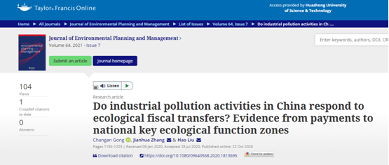 本文讯(通讯员 张鹃)2021年4月,国际期刊《环境规划与管理杂志》(Journal of Environmental Planning and Management,Volume 64Issue 7, 2021)刊发了公司张建华教授团队最新研究成果“Do industrial pollution activities in China respond to ecological fiscal transfers? Evidence from payments to national key ecological function zones”(生态转移支付对工业污染的影响:以国家重点生态功能区政策为例)。张建华教授的博士生龚长安为第一作者,张建华教授为第二作者与通讯作者,山东大学副教授刘浩为第三作者与通讯作者。