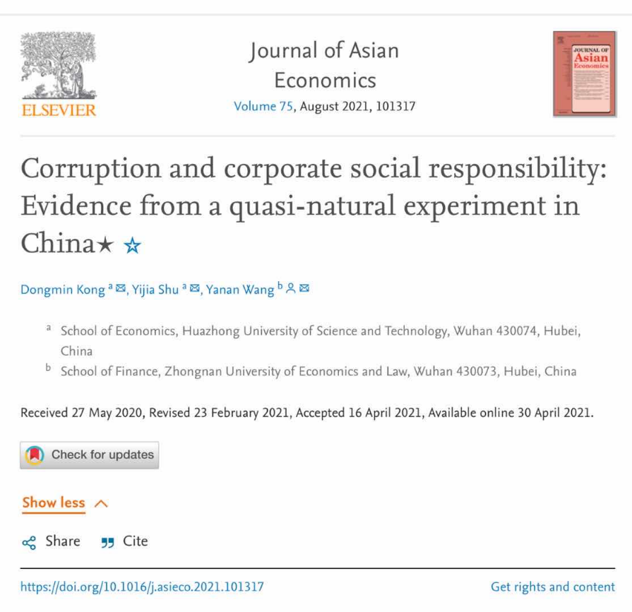 2017级本科生疏艺佳同学也同样在孔老师的指导下,师生研究成果“Corruption and corporate social responsibility ”被SSCI期刊Journal of AsiaEconomics接受发表。疏艺佳同学将于2021年9月继续在永利3044noc攻读硕士研究生。