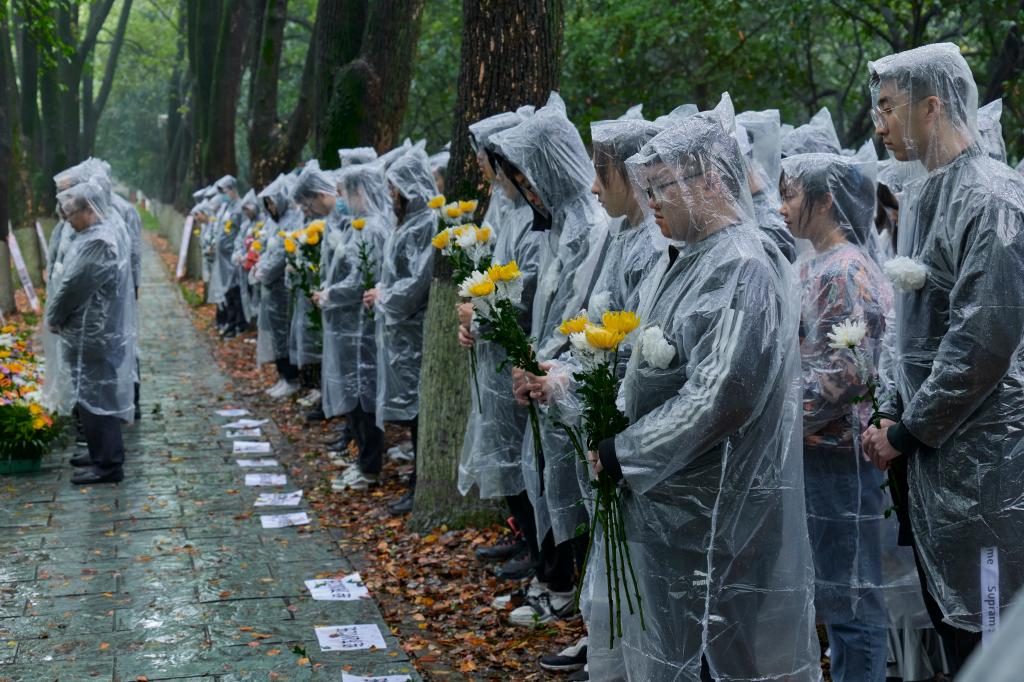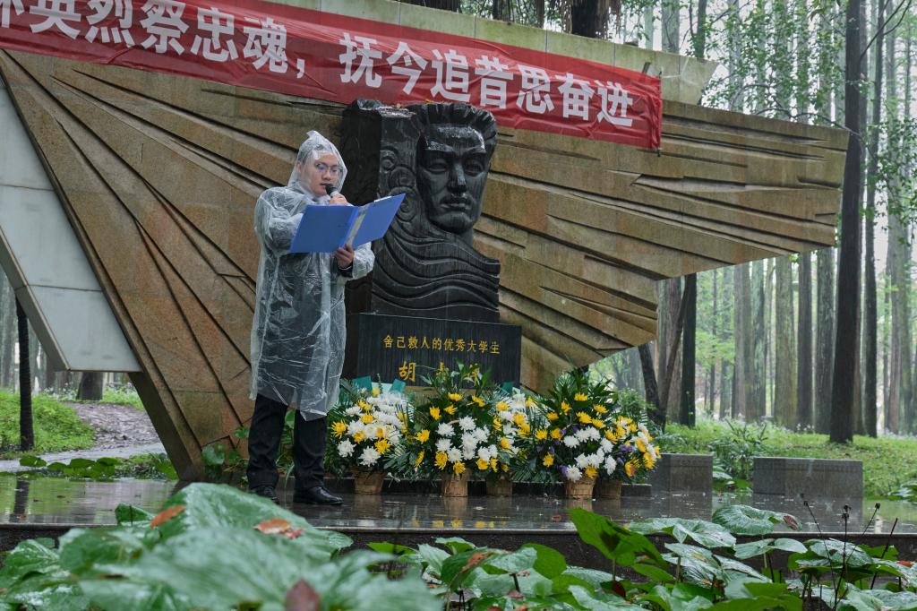 生命如花,责任无价。最美的花献给最可爱的人。与会领导和员工代表向胡吉伟塑像敬献花篮。风雨交加的天气,正如缅怀英烈的沉重心情,经院师生在庄严鞠躬中,对胡吉伟学长表示最深切的悼念和敬意。