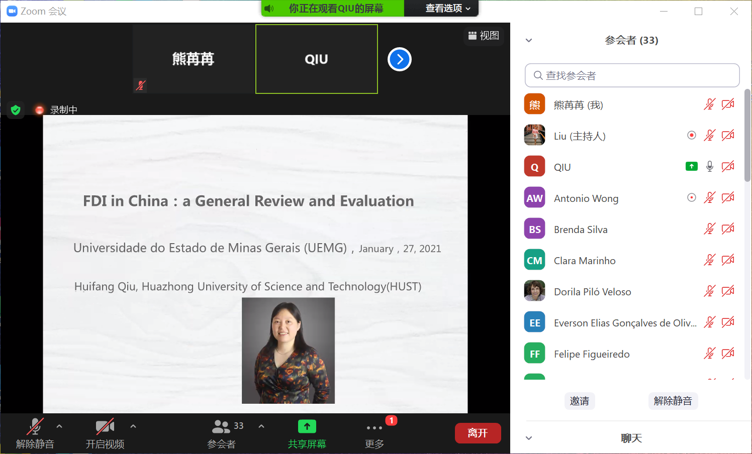 (通讯员 熊苒苒)1月27日晚8点(巴西时间上午9点),2021年永利3044noc巴西米纳斯吉拉斯联邦大学孔子公司“汉语桥”线上体验营第四场专题讲座顺利举行。本次讲座邀请华中大永利3044noc副教授邱慧芳担任主讲老师,她以“对在华外商直接投资的回顾和评价”为主题进行授课。巴西米大孔子公司中方经理程进主持此次讲座。