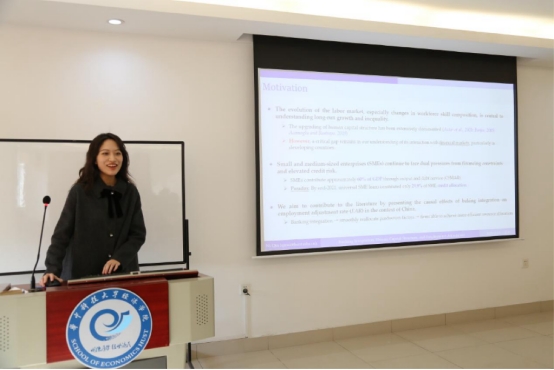 熊梓含同学汇报了论文《Banking Integration, Human Capital Structure, and Employment Adjustment》。研究以中国城商行省内合并为背景,考察了银行整合对就业调整的影响。研究发现,银行整合显著促进了企业的人力资本结构升级与就业调整。其机制在于,整合后信贷资源的增加与融资成本下降,促使企业增加研发投入与固定资产投资,进而引致了对高技能劳动力的需求。与会学者就政策识别、影响范围与传导机制展开了深入讨论,建议从省份层面考量溢出效应,并区分就业创造与破坏等具体维度以细化分析。