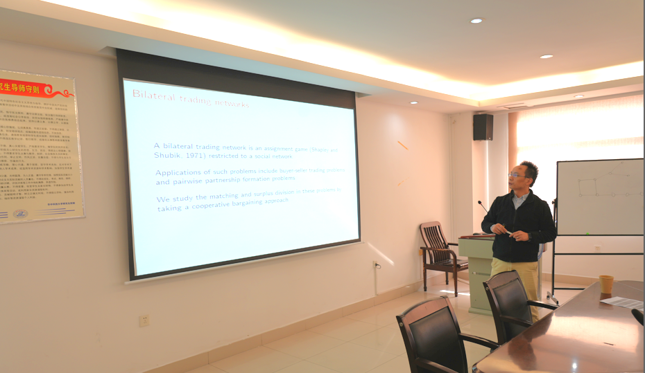 唐前锋以《Credible Nash Bargaining Solution for Bilateral Trading Networks》为题进行报告。他深入剖析了双边交易网络这一关键领域,明确指出在该网络环境里,买家与卖家凭借网络构建起连接关系,每一组成功连接的买卖双方均可通过匹配来创造盈余。他着重阐释了可信谈判解(CBS)这一核心概念,在研究进程中,他成功地对单位盈余情形下的 CBS 集合进行了全面且精确的刻画,同时有力地证实了在一般盈余情形下 CBS 的存在性。