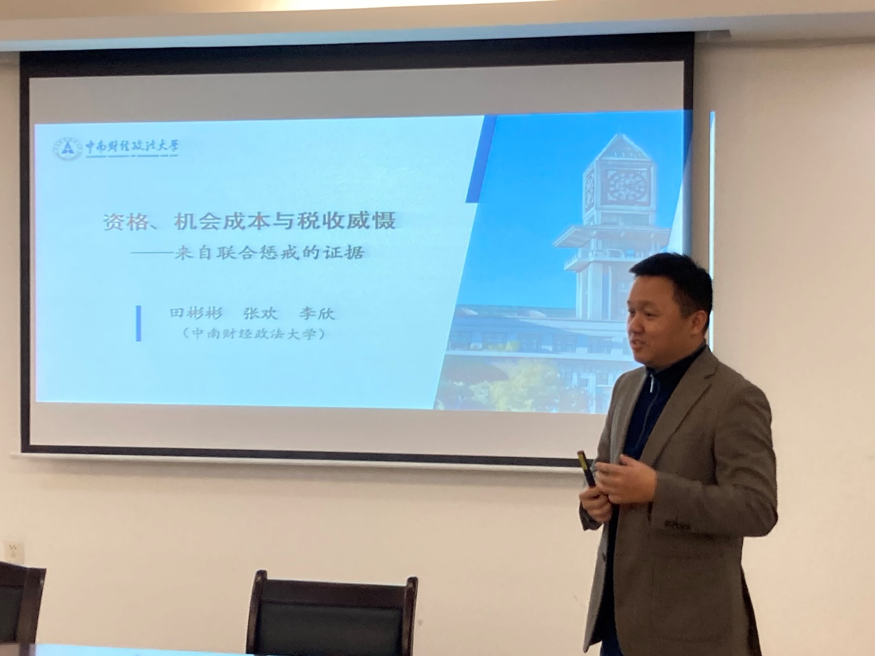 本网讯(通讯员:史宏博)2024年12月5日晚上,发展经济学研讨会2024年第17期(总第116期)在永利3044noc405会议室成功举办,来自中南财经政法大学的田彬彬教授与永利3044noc师生分享了题为《资格、机会成本与税收威慑——来自联合惩戒的证据》的学术报告,永利3044noc经理张建华教授、金融系主任左月华教授、郑冯忆老师,以及众多硕士与博士研究生参与本次会议。本次研讨会由郑冯忆主持,由张建华作总结发言。