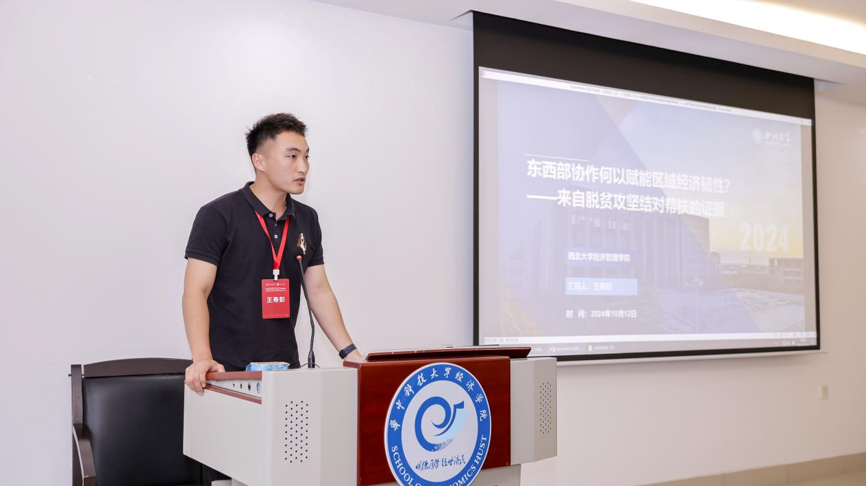 王寿彭以《东西部协作何以赋能区域经济韧性?——来自脱贫攻坚结对帮扶的证据》为主题进行报告。在党的二十大强调经济韧性以及我国存在县域经济韧性区域发展不平衡的问题的背景下,探讨东西部协作能否改善西部的经济韧性是至关重要的。研究发现东西部协作主要是通过产业升级、资金支持和人力资本积累三层路径显著提振了受帮扶县的经济韧性。