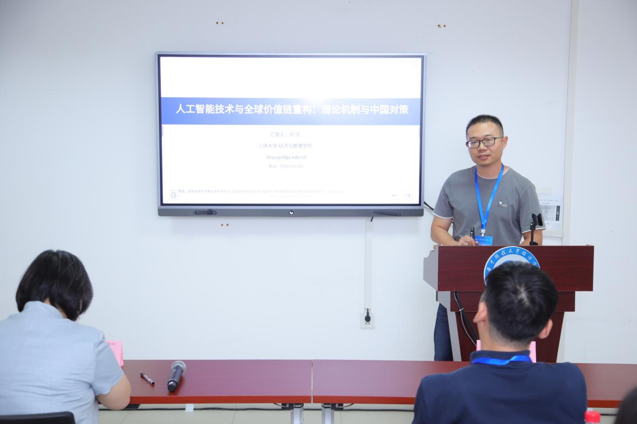何宇副教授以《人工智能技术如何引领全球价值链重构:理论机制与中国对策》为主题进行报告。报告深入分析了人工智能技术在推动产业变革和全球价值链重构中的关键作用。报告指出,人工智能技术作为数据要素驱动的自动化技术,不仅改变了生产实践中劳动与生产资料的组合方式,而且对全球贸易分工形态产生了显著影响。通过构建多国—多阶段全球价值链竞争模型,报告探讨了人工智能技术如何重塑全球价值链分工格局,并提出了中国应对新一轮科技革命的策略。报告建议,中国应加大对创新资本投资的政策支持,通过专业化技术培训促进劳动与智能化技术的适配性,以利用人工智能技术推动产业升级和全球价值链地位的提升。