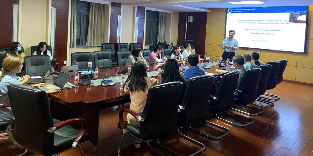 本网讯(通讯员:晏琦)9月20日晚,2023年发展经济学研讨会(十一)在公司307会议室与腾讯会议同步举行,来自德国哥廷根大学的于晓华教授与公司师生分享了题为《Climate Change and Cropland Abandonment in China: Evidence from Remote Sensing and Machine Learning》的学术报告,公司经理张建华、国贸系主任范红忠、金融系主任左月华、教师代表张斯琦、贾潇等,众多硕士与博士研究生参与本次会议。本次研讨会由张斯琦主持,由张建华作总结发言。