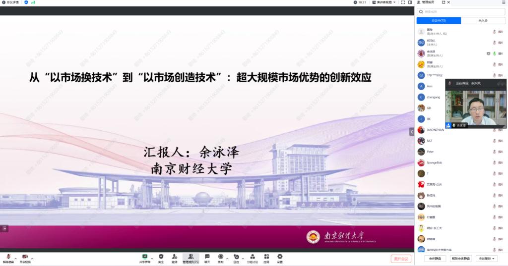 本网讯(通讯员:晏琦)9月14日下午14:30,2·023年发展经济学研讨会(十)在腾讯会议上举行,来自南京财经大学国际经贸公司的余泳泽教授与公司师生分享了题为《从“以市场换技术”到“以市场创造技术”:超大规模市场优势的创新效应》的学术报告,公司左月华、邢斐、马诗卉等教师,以及众多硕士与博士研究生参与本次会议。本次研讨会由邢斐副教授主持。