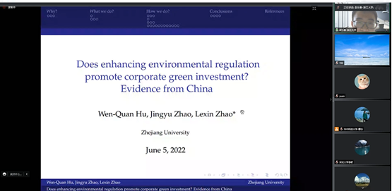 第五位报告人是来自浙江大学的赵乐新同学,他的题目是《Does enhancing environmental regulation promote corporate green investment? Evidence from China》。文章基于EPT改革为准自然实验,利用中国上市公司数据和多期DID方法,研究环境保护税法实施对企业绿色投资的影响,主要从研究国家选取、研究问题、研究方法及结论展开。研究发现,环境规制的加强对企业绿色投资产生了负面影响,处理组的绿色投资平均减少了1957万元。文章的机制检验发现,融资约束的抑制效应和研发支出的挤出效应是环境规制加强对企业绿色投资产生负面影响的机制路径。进一步地,文章进一步讨论了异质性。研究发现,非国有企业、小规模公司和东部地区企业减少的绿色投资更多。基于以上结论,文章提出以下政策建议。其一,决策者可以通过适当的税收激励(如税收减免)在短期内缓解环境监管增加的压力;其二,中国的金融体系以国有银行为主,对小企业和非国有企业给予更多的信贷支持可能是一个很好的选择;其三,虽然中国对地方官员的考核逐步从地方GDP转变为包括在绩效在内的更综合的指标,但环境绩效的比例应得到提高。报告完毕后,公司陈波老师就公司税收逃逸行为问题等同赵乐新博士进行了探讨。