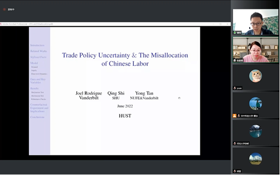 第六位报告人是来自南京财经大学的谭用副教授,他的题目是《Trade Policy Uncertainty & Misallocation of Chinese labor》。未来需求的不确定性往往会降低企业层面的投资和生产激励,企业层面的非活跃投资和投入要素的块状调整成本导致资源错配,在此背景下,文章研究贸易政策不确定性(TPU)对企业层面劳动力错配的影响。文中关于劳动力错配的定义Gap为企业劳动边际产品与劳动工资的差额。文章研究发现,当中国加入WTO之后,企业层面的劳动力错配会减少,平均而言,对于在加入WTO之前,面临不确定性更高的企业,他们的劳动力错配减少的更快。中国加入WTO的事件,本质上是减少了企业对未来需求的不确定性,这会在较大程度上使得企业去调整劳动力和资本存量等动机,从而减少了劳动力错配,使得所有的资源更加的合理。资源配置合理带来的是整个行业及企业层面的TFP上升。报告完毕后,会议中同学就Gap衡量问题等同谭用老师进行了探讨。公司陈波老师就实证中的样本回归问题等同谭用老师进行了探讨。