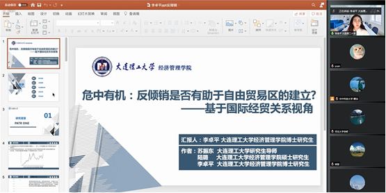 第四位报告人是来自大连理工大学的李卓平,她的论文题目是《危中有机:反倾销是否有助于自由贸易区的建立?——基于国际经贸关系视角》。文章基于Probit模型,考察全球反倾销发起和全球自由贸易协定的关系,研究发现,两国之间发起的反倾销累计数越多,双方越有可能在未来签订区域贸易协定、成立自由贸易区。进一步的异质性分析发现,具有相似经济发展水平、技术和生活水平的两个国家之间发起的反倾销对其后成立FTA的促进效果更显著。基于以上结论,文章提出如下建议。其一,针对那些频繁与我国发生经贸摩擦的重要贸易伙伴国,积极寻求通过缔结FTA改善两国经贸关系,促使两国之间从对抗走向合作共赢;其二,针对那些尚未与我国频繁发生经贸摩擦的重要贸易伙伴国,也要主动通过缔结FTA等经贸合作措施,防范未来可能发生的经贸对抗;其三,在FTA中合理设计贸易争端解决机制以化解协定伙伴国之间的贸易摩擦。其四,保持正确心态妥善应对对华贸易摩擦。报告完毕后,会议中同学就模型内生性问题等同李卓平博士进行了探讨。