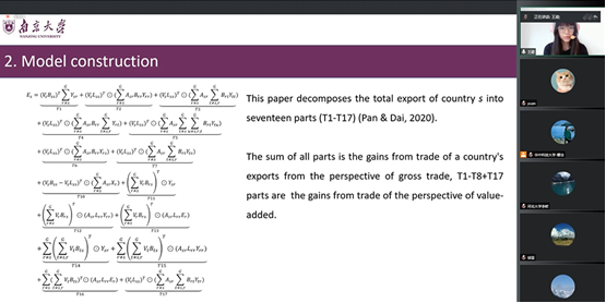 第一位报告人是来自南京大学的王迎,她的论文题目是《A New Perspective on Gains from Trade in Global Value Chains: Evidence from China》。论文主要讨论三个主要问题,目前已有研究中衡量贸易利益水平是否能够准确计算反映实际水平?影响中国贸易利益水平的主要因素有哪些?中国作为第三国或出口国身份所获得的增加值对中国提高其贸易利益有哪些影响?文章首先从国家层面分析了全球价值链分工对中国全球价值链的影响,研究发现,一个国家双边参与度水平与本国的贸易利益水平显著正相关,表明一个国家的分工参与度越高,其获得的贸易利益水平就会越大。其次,从行业层面分析进行考察,研究发现,一个行业的分工地位与该行业的贸易利益呈现显著正相关,表明一个国家的行业分工地位越高,其对于贸易利益水平的影响会越大。最后,文章从国家层面和行业层面验证作用机制,研究表明,一个国家的分工水平会通过影响分工深度,进而对国家的真实贸易利益水平产生影响。文章指出,未来的研究可以将国家层面和企业层面的全球价值链问题结合起来,对其影响的细微差别提供更现实的见解并提出更具体的政策建议。报告完毕后,公司陈波老师就相关指标构建等同王迎博士进行了探讨。