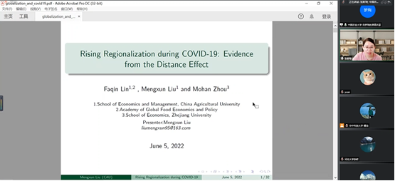 第二位报告人是来自中国农业大学的刘梦珣,她的论文题目是《Rising regionalization during COVID-19: Evidence from the distance effect》。文章基于引力模型,利用全球200个国家的双边贸易数据,考察新冠疫情如何以前所未有的方式影响距离效应。研究发现,新冠肺炎疫情使全球化倒退。具体地,距离效应在新冠肺炎疫情期间有所增加,并且这种效应不是由于传统“距离之谜”产生的原因造成的,同时这种效用不会受到中美贸易战等其他混杂因素的影响。通过构建垄断竞争的古诺模型,探讨文章的作用机制,研究发现,新冠肺炎疫情会显著影响各国之间的贸易关系,迫使各个国家转向同近距离国家,且这种影响在发达国家和发展中国家的影响不显著。另外,运输中断的作用非常关键。针对上述结论文章提出相关建议。其一,加强同周边国家的区域合作,防范疫情风险,构建灵活的贸易网络。同时,世贸组织等国际组织应发挥协调作用,避免全球化过度收缩;其二,通过扩大国际运输能力建设,制定运输风险应急预案,构建更加稳定、更具有韧性的全球贸易运输网络,增强国际运输行业抗风险能力。报告完毕后,南京财经大学的谭用老师就“距离之谜”等同刘梦珣博士进行了探讨,之后,公司陈波老师就文章的框架逻辑等同刘梦珣博士进行了探讨。