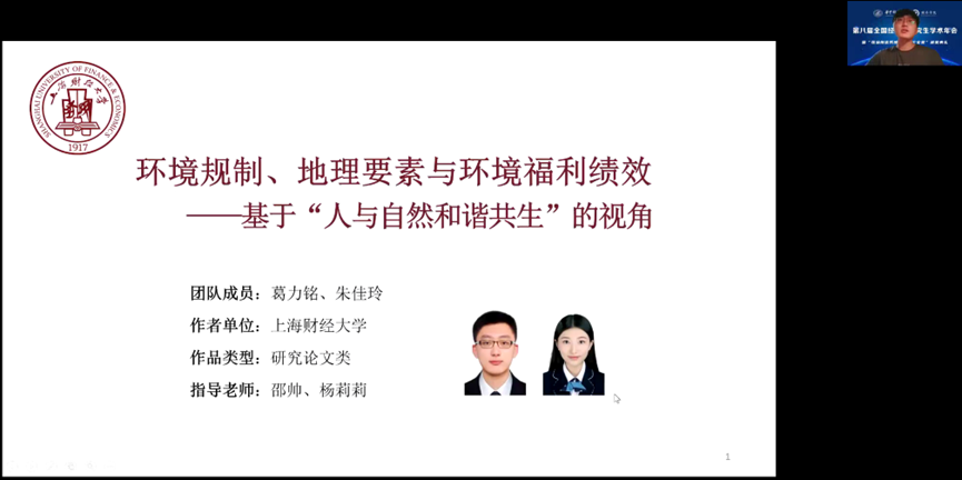 第二位作报告的研究生是来自上海财经大学的葛力铭。他的论文题目是《环境规制、地理要素与环境福利绩效——基于“人与自然和谐共生的视角”》。“万物各得其和以生,各得其养以成”。如何在尊重、顺应和保护自然的前提下充分释放环境规制的制度红利,从而有效促进以稳增长、保环境和增福祉为主要表征的环境福利绩效改善,是决定我国能否实现“人与自然和谐共生”目标的关键所在。本文首先在考虑地理要素的条件下,分别从静态与动态视角就环境规制对环境福利绩效的潜在影响进行阐释;进而,基于2003-2018年中国285个地级及以上城市的面板数据,采用关联网络数据包络分析法对环境福利绩效进行了准确测算,并通过对政府工作报告的文本分词处理对地方政府的环境规制力度予以表征;继而,采用固定效应模型、调节效应模型、空间杜宾模型和工具变量法等多种计量分析方法,实证考察了环境规制对环境福利绩效的影响及其作用机制。研究发现,环境规制显著促进环境福利绩效,这一结论在进行一系列稳健性检验和控制内生性问题后依然成立。自然地理要素会对环境规制的环境福利效应产生调节作用,它会通过五大社会经济要素机制对其产生影响。环境规制的环境福利效应在我国不同地理区位上呈现显著的异质性,东部地区、南方地区、胡焕庸线东南侧地区、特大及大城市与非资源型城市的环境规制对环境福利绩效的促增效果更明显;环境规制可以通过推动经济增长、突破技术创新、释放人才红利和优化产业结构而改善环境福利绩效,并通过加剧资本错配程度而促降环境福利绩效。本文的启示是:第一就是常抓不懈地区环境规制强度,设立于软硬兼施的环境规制执行办法。第二是不可偏废地理要素的执行前,在执行成本因地制宜地调整地区环境规制。第三是因势利导地调动环境规制对社会经济要素的促进作用,实事求是地去解决环境治理当中产生的错配问题。第四,是齐头并进,污染联控的环境规制空间布局,革故鼎新环境福利绩效的虹吸式路径依赖。