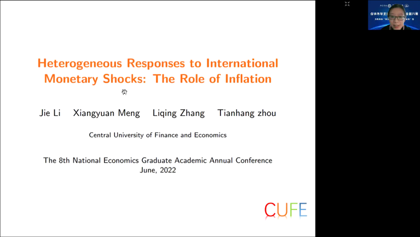 首先来自中央财经大学的孟祥源报告了他的研究《Heterogeneous Responses to International Monetary Shocks: the Role of Inflation》。在三元悖论假设的背景下,本文记录了国际货币冲击的不同反应,强调了通货膨胀的重要作用。外围国家的货币政策自主权取决于其通货膨胀。当中心国家加息时,高通胀的外围国家更愿意跟进。相比之下,通货膨胀率低的国家则不愿意这样做,反之亦然。本文进一步证实,灵活的汇率制度或资本管制增强了外围国家的货币政策自主权,这与三元悖论假设一致。