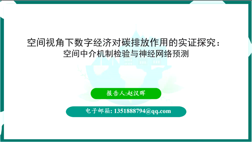 第四位汇报人是来自广东财经大学的赵汉晖,她带来了题为《空间视角下数字经济对碳排放作用的实证探究:空间中介机制检验与神经网络预测》的论文汇报。数字经济在为中国经济的转型升级提供了核心竞争力同时也对碳减排产生了重要作用。本文基于2011-2019年中国30个省市自治区的面板数据,通过空间计量模型创造性采用空间中间模型和神经网络预测来探究数字经济对碳排放的作用以及影响机制。实证研究表明:数字经济显著降低了本地的碳排放,但是对周边地区碳排放的作用并不显著。数字经济通过推动能源产业结构转型和绿色技术创新降低本地碳排放,通过促进能源利用效率提升和绿色技术进步降低周边地区碳排放,且数字经济还能帮助产业模式转变,增加本地和周边地区的产业集约程度从而降低本地和周边地区碳排放。进一步通过神经网络的预测表明,数字经济将在较为发达的地区体现出显著的碳减排效果,在数字较为落后地区不体现出明显的效果,而在数字经济最落后的地区,数字经济会体现出增加碳排放量的效果。