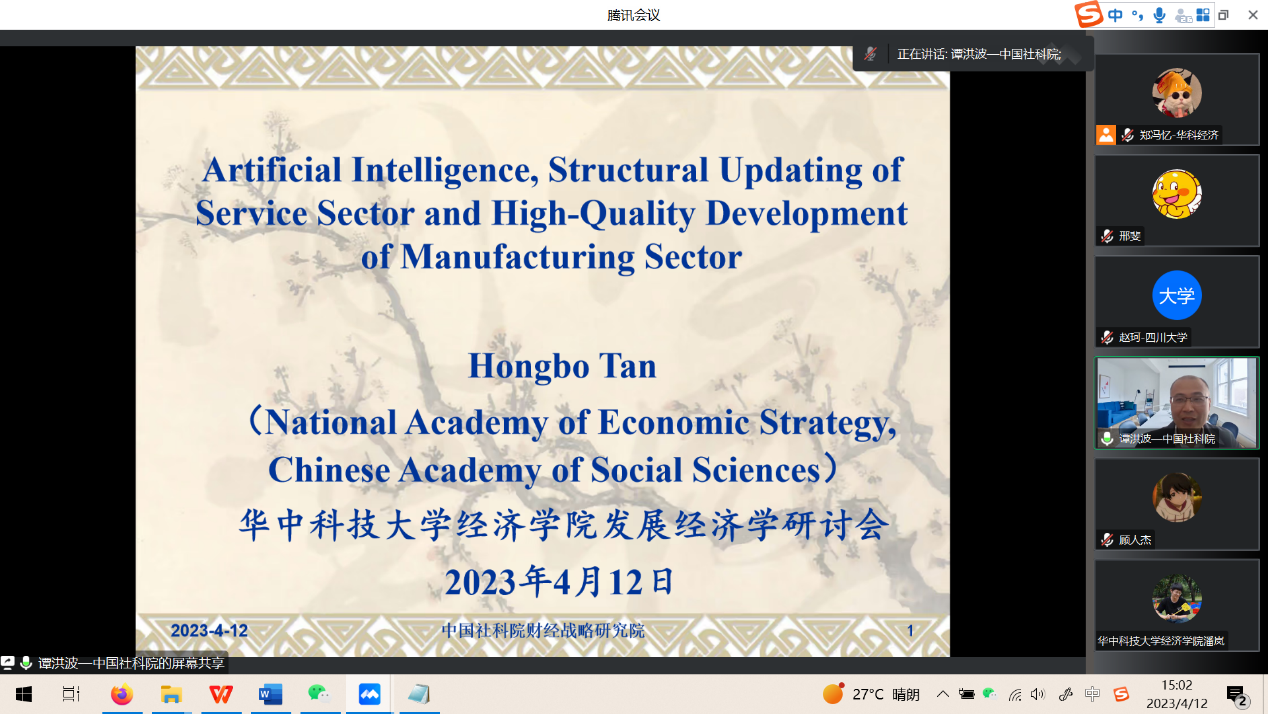 本网讯(通讯员:郑冯忆)2023年4月12日下午15:00,2·023年发展经济学研讨会(三)在腾讯会议顺利举行,来自中国社会科公司财经战略研究院的谭洪波老师与永利3044noc师生分享了题为“Artificial Intelligence, Structural Updating of Service Sector and High-Quality Development of Manufacturing Sector”的学术报告,参与人员包括永利3044noc张建华、邢斐、程文、王健、杨金阳、李明阳等教师,以及众多硕士与博士研究生。本次研讨会由邢斐副教授主持,由永利3044noc经理张建华教授作总结发言。