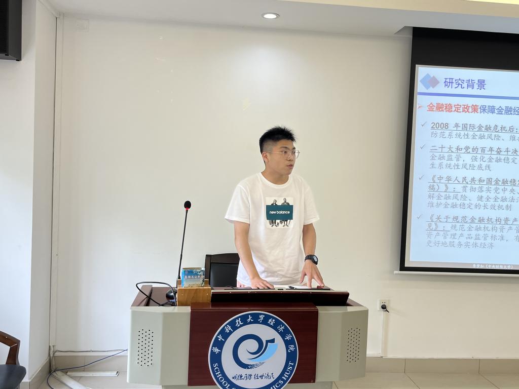 第五位报告人是来自中央财经大学的李梦如,他的论文题目是《金融稳定政策的实体经济风险治理效应一基于资管新规的准自然实验》。他按照文章的结构从研究背景,制度背景,理论分析与研究假设,研究设计,实证结果,机制解释和结论展开阐述。在经济金融化格局下,金融对实体经济的影响日益加深,强化金融稳定政策是防控实体经济风险、促进经济高质量发展的必然要求。文章将资管新规作为一次外生的金融稳定政策冲击,并以2015至2020年中国A股非金融上市企业的面板数据为研究样本,运用双重差分法考察资管新规对企业经营风险的影响,从而检验金融稳定政策的实体经济风险治理效应。研究得到以下三个主要结论。第一,在资管新规实施后,高金融化企业的经营风险平均下降超过20%,证明资管新规产生了显著的实体经济风险治理效应。第二,基于公司治理效率的异质性分析表明,资管新规在公司治理效率更低的企业中产生的风险治理效应更强。第三,资管新规对企业经营风险的影响存在两条作用渠道。首先,资管新规会压缩企业的金融投资,降低实体经济与金融体系的系统性风险联动,抑制金融风险向实体部门传染;其次,资管新规还会促进企业的实体投资,降低未来现金流不确定性,进而降低企业经营风险。