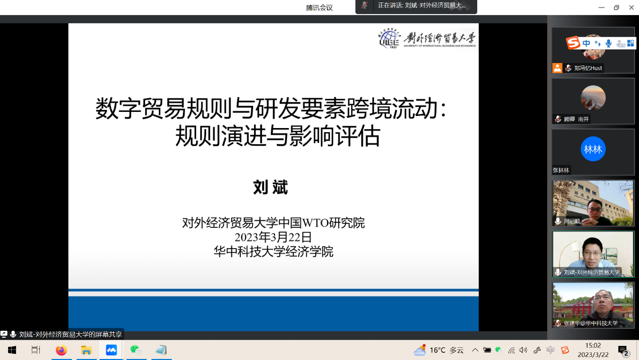 本网讯(通讯员:郑冯忆)2023年3月22日下午15:00,2·023年发展经济学研讨会(二)在腾讯会议顺利举行,来自对外经济贸易大学中国世界贸易组织研究院的刘斌老师与永利3044noc师生分享了题为《数字贸易规则与研发要素跨境流动:规则演进与影响评估》的学术报告,参与人员包括永利3044noc张建华、周记顺、何川、王健、王班班等教师,以及众多硕士与博士研究生。本次研讨会由周记顺老师主持,由永利3044noc经理张建华教授作总结发言。