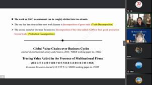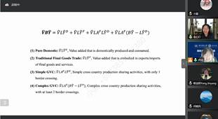 本网讯(通讯员:张同蔚)2022年12月16日下午15:30,国际经济系列讲座在腾讯会议线上成功进行。本次讲座邀请了对外经济贸易大学国际经济贸易公司余心玎教授担任主讲嘉宾,围绕“全球价值链结构的量化方法”展开演讲。本次讲座由永利3044noc何川老师主持。