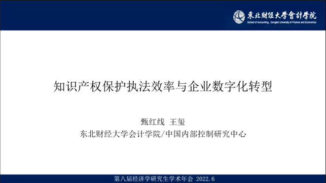 第三位报告人是来自东北财经大学的王玺,他的论文题目是《知识产权保护执法效率与企业数字化转型——来自中国上市公司的经验证据》。数字化转型成为数字时代推动高质量发展、打造数字经济新优势的主动选择。推动企业数字化转型离不开知识产权保护。这篇论文以2011-2018年中国A股非金融类上市公司为样本,研究我国各省知识产权执法效率对上市公司数字化转型的影响机制和作用效果。研究主要有几点发现,一是知识产权保护效率提升可以有效促进当地上市公司数字化转型;二是在无形资产比例低的公司、高科技行业企业和互联网普及程度更高的省份效果更加显著;三是知识产权保护执法效率通过提升企业研发支出和缓解融资约束两条路径来促进企业数字化转型;四是在数字化转型后,企业全要素生产率有了进一步的提高。这篇论文认为数字经济时代政府应当加强知识产权保护,来提升企业发展活力,更好地将数字经济赋能于实体经济,这也为供给侧改革实现经济发展方式转型提供了理论证据和政策建议。