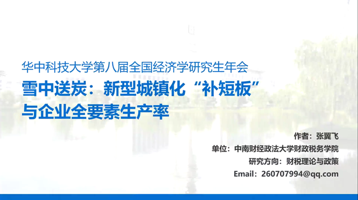 第五位报告人是来自中南财经政法大学的张翼飞,他的论文题目是《雪中送炭:新型城镇化“补短板”与企业全要素生产率》。这篇论文以2013年棚户区改造新政为准自然实验,运用2011-2015年工业企业面板数据和强度DID模型实证分析新型城镇化“补短板”对企业全要素生产率的影响。研究结果主要有三点,一是棚户区改造新政实施后,企业全要素生产率稳步提升,缘于政府积极将财政用于民生所需,实施了“保生产”“促交流”“重环保”“强服务”四项优化营商环境的举措,解决了公共产品和服务对企业的“最后一公里”问题;二是政府转变“唯规模”的财政思想,在现时住房保障、中期基础设施和公共服务完善、长期经济增长中坚持“质量为重”“合作协调”“开放共享”,对企业全要素生产率提升具有积极影响;三是棚户区改造新政实施效果因企业外部环境、企业特征和经营状况而异。研究结论为推进以人为核心的新型城镇化提供了有益启示。