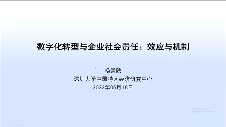 第二位报告人是来自深圳大学的杨景院,他的论文题目是《企业联网化与企业社会责任:效应与机制》。“十四五”规划纲要明确提出要更加积极有为地促进共同富裕,其中推动企业积极履行社会责任是促进共同富裕的一种重要方式。这篇论文利用第十二次中国私营企业调查数据,考察了民营企业互联网化对企业在内部与外部履行社会责任行为的影响及其作用机制与异质性。主要有一下几个结论,一是企业互联网化对企业社会责任具有明显的促增效应,能够显著推动企业发展社会公益与提高职工关怀;二是企业互联网化对企业内部职工关怀产生的正向影响效应,大于其对企业外部社会公益发展产生的正向影响效应;三是机制检验发现,地位较高的企业主,其企业互联网化对企业社会责任表现的提升效果明显减弱,拥有政治联系企业主的企业互联网化对企业社会责任的提升效果,相较于没有政治联系企业主的企业明显减弱,党组织嵌入的企业互联网化对企业社会责任的提升效果显著弱于尚未建立党组织的企业。此外,企业互联网化通过提升企业净利润、盈利能力与劳动生产率等企业财务绩效水平,进而促进企业社会责任表现。这篇文章的研究丰富与补充了民营企业社会责任相关研究,同时也为在数字经济时代扎实推进企业社会责任的政策建议提供经验依据。