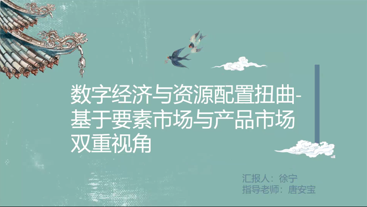 第一位报告人是来自中国矿业大学的徐宁,她的论文题目是《数字经济与资源配置扭曲——基于要素市场与产品市场双重视角》。大量研究在传统的HK框架下发现要素市场扭曲引起的资源错配会造成TFP的无谓损失,但传统的HK框架假定替代弹性为常数使其忽视了产品市场扭曲引起的资源错配。基于此,这篇论文运用2011-2015年中国工业微观企业数据库与268个城市面板数据,基于要素市场和产品市场双重视角,研究了数字经济发展与资源配置扭曲之间的关系。研究主要发现有三点,一是数字经济显著改善了中国资源配置扭曲,其中对要素市场的改善效果优于产品市场,二是数字经济的改善作用在高成长性企业、非国有企业和高技术企业更能显著体现机制检验表明数字经济提高了行业的进入壁垒且增加了企业代理成本,三是研究发现在进口贸易增长的不同阶段,数字经济与资本配置扭曲之间存在非线性关系。