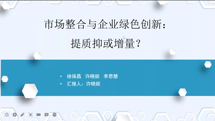 第四位报告人是来自青岛大学的许晓妮,她的论文题目是《市场整合与企业绿色创新:提质抑或增量?》。依托市场推动企业绿色转型是中国实现高质量发展的重要支撑,而政府干预市场的选择性行为却改变着市场整合的应有效果,并对企业绿色创新质量产生不利影响。这篇论文利用长三角地区市场整合数据与中国A股上市公司的匹配数据,实证检验了市场整合对企业绿色创新的影响及其作用路径。研究主要有以下几个发现,一是市场整合促进了企业绿色创新质量提升,而对绿色创新数量影响不显著;二是市场整合可以通过缓解融资约束和加大创新投入两个途径促进企业绿色创新质量;三是市场整合提高了专利密集型企业和大规模企业的绿色创新数量,提升了专利密集型企业和小规模企业的绿色创新质量。这篇论文的研究表明,加速区域间市场整合,打破要素资源流动障碍,推动全国统一大市场建设,是促进企业绿色创新,推动经济社会全面绿色转型和实现经济发展与环境保护协同共进的有效路径。