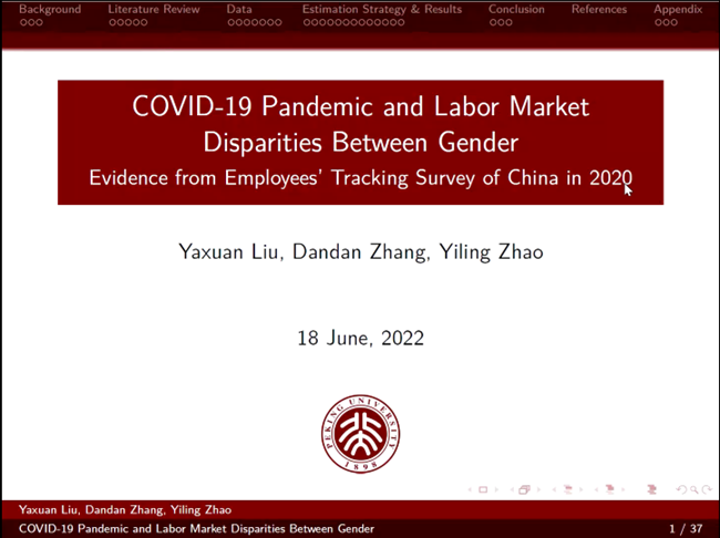 第五位报告人是来北京大学的刘雅玄,她的论文题目是《COVID-19 Pandemic and Labor Market Disparities Between Gender: Evidence from Employees' Tracking Survey of China in 2020》。这篇论文基于从业人员个体追踪调查,全面分析了新冠疫情对我国劳动力市场的影响及其政策含义。2020年至今新冠疫情的暴发,不仅威胁了人们的健康、对经济带来冲击,同时也极大地改变了人们的工作和生活方式。特别是社交距离、封城等疫情防控措施,使得疫情期间大量的社会生产活动转由家庭承担,比如原本可以购买的家政服务减少;对于有子女的家庭来说,公司、育儿机构停业导致育儿负担大幅度增加。这些无形中增加的家庭生产活动,在家庭内部产生了男女之间的较量和制衡。这篇论文使用有代表性的追踪数据对性别差异在疫情外生冲击下的变化进行系统性分析;由于收集了个体及配偶在工作和生活多个维度的数据,可以深入探讨性别差距的表现形式和影响机制,并分析家庭分工和配偶对比的动态变化情况。论文主要有五点研究发现,一是与男性劳动者相比,女性劳动者在复工可能性、工作时长和收入等方面均处于劣势;二是劳动力市场的性别差距随着疫情后经济复苏而扩大;三是已婚女性,特别是有学龄前子女的女性劳动者,在新冠肺炎疫情爆发后面临的失业风险更大;四是在家庭分工中,妻子花费更多的时间在家庭活动(如照顾孩子、做家务)上,较少参与社会活动;五是女性的心理健康程度持续不如男性,其中工作状态、时间分配和社交参与程度是造成心理健康的性别差异的重要渠道。