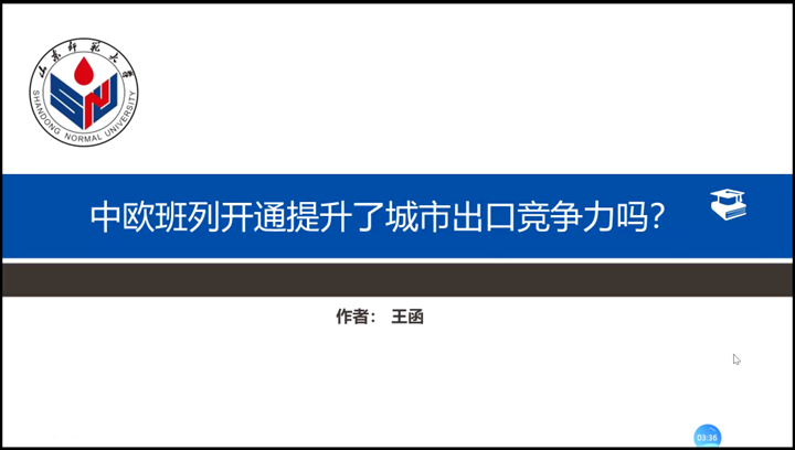 第四位报告人是来山东师范大学的王函,她的论文题目是《中欧班列开通提升了城市出口竞争力吗?》。中欧班列是推进“一带一路”建设和深化对外开放的重要交通设施。这篇论文基于2005—2019年我国283个地级市数据,利用多期DID模型,以出口竞争力为切入点,系统分析了中欧班列开通的经济效应。研究发现:中欧班列开通有效提高了城市出口竞争力,该结论在接受稳健性检验后依然成立。此外,创新、金融发展、贸易开放是中欧班列作用于城市出口竞争力的三条路径。异质性分析表明,中欧班列对城市出口竞争力的提升效果在中西部区域和中心城市更加明显,与自由贸易试验区和“一带一路”倡议的联动更能深化中欧班列的经济效应。拓展性分析显示,统一品牌后的中欧班列表现出发展的可持续性,基于发送量和回程比率考虑,中欧班列高质量发展前景广阔,城市合作和铁海联运的新趋势也有助于中欧班列经济效应的发挥。以上结论表明中欧班列开通可助力城市出口竞争力提高,加速建设新时代贸易强国。