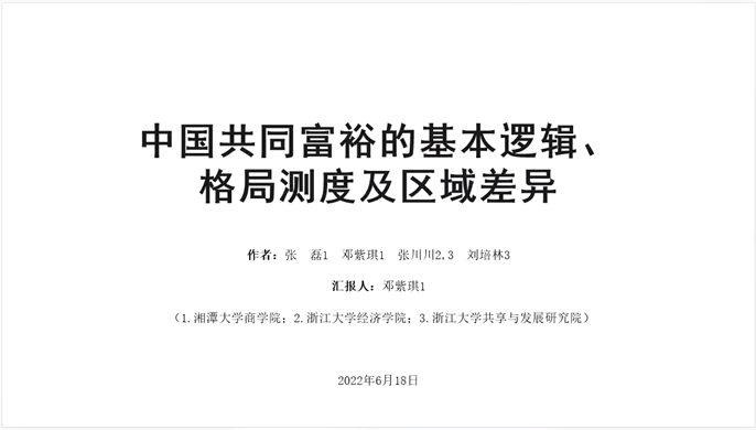 第二位报告人是来自湘潭大学的邓紫琪,她的论文题目是《中国共同富裕的基本逻辑、格局测度及区域差异研究》。科学测度中国共同富裕总体格局,系统分析其动态演变的区域差异特征及相对薄弱环节,是因地制宜推动共同富裕的关键前提。这篇文章基于历史唯物主义方法厘清共同富裕的权利逻辑,通过虚拟最劣解TOPSIS、灰色关联度的动态评价模型及耦合协调度模型构建和测算中国共同富裕指数,并运用动态核密度估计、联合密度分布图考察共同富裕的空间特征。研究结果主要有三点,一是全国及东、中、西部地区共同富裕的权利子系统配置不平衡,保障权配置相对滞后,各省份之间收入权、保障权子系统差距较大;二是全国整体及各地区共同富裕指数逐年提升,但各省份之间差距较大,其中东部省份具有活力,中部缺乏活力,西部正在形成向东、中部追赶的态势;三是全国及东、中、西部地区共同富裕程度均呈现“高—高”“低—低”的空间聚集模式,且本省共同富裕滞后指数与邻省指数正相关,存在“先富带后富”的空间辐射效应。