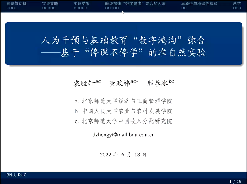 最后一位同学是来自北京师范大学的袁胜轩,他的论文题目是《人为干预与基础教育“数字鸿沟”弥合——基于“停课不停学”的准自然实验》。网络接入及其资源可及性和网络使用能力这“两道数字鸿沟”,尤其是后者,正在深远地影响着信息化对基础教育公平的促进能力。本文利用“停课不停学”带来的准自然实验间接测算了“数字鸿沟”,尤其是“第二道数字鸿沟”的大小,并检验了人为干预能否加速其弥合。实证结果发现:“停课不停学”前高和低经济社会发展水平地区对在线学习资源关注度的差距为60%-90%,而“停课不停学”下低发展水平地区关注度的增幅比高发展水平地区高7%-16%,人为干预的溢出效应使得部分家庭对在线学习资源自发的关注增加了。研究结果说明,虽然“第二道数字鸿沟”体现出较大的区域差距,但是人为干预可通过触发信息化意识自发提升而加速其的弥合,未来信息化促进基础教育公平工作应当考虑着力驱动“人为力量”。