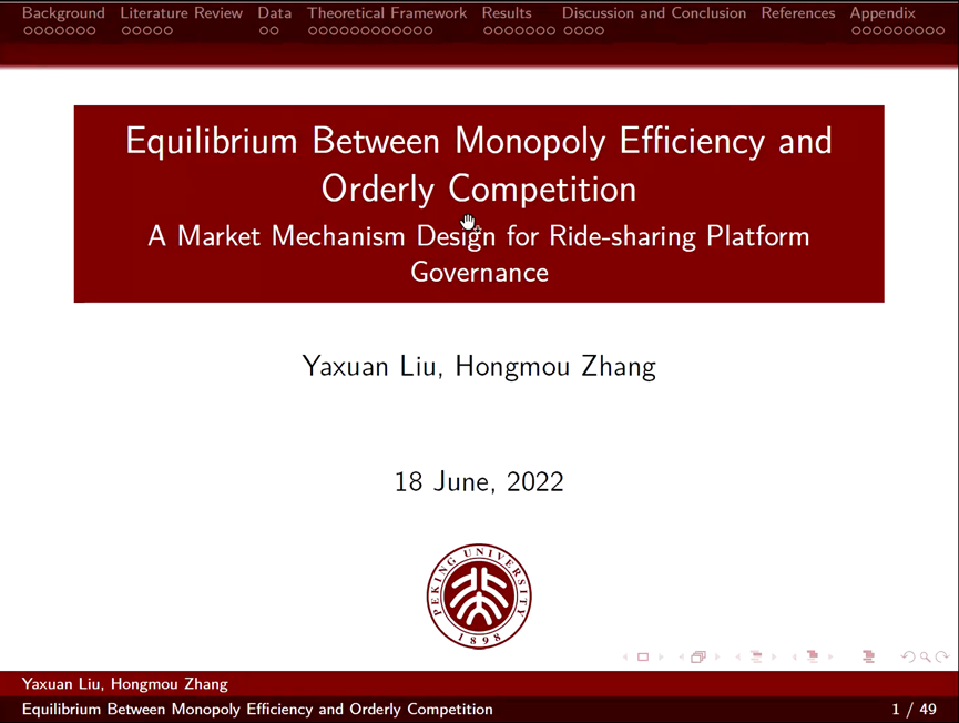 第二位作报告的研究生是来自北京大学的刘雅玄。她的论文题目是《垄断效率和有序竞争——基于一种共享出行平台治理方法的机制设计》。共享出行服务的平台公司即TNC,能提供一种相对灵活且价格较为低廉的服务,成为了出租车之外的一个新选项。同时网约车的一个特点是可以更好地实现拼车来节省一些里程。这能解决一部分城市的拥堵或空气污染等问题。但是我国的头部的公司比如滴滴,占据了大部分的市场份额,它也因此受到了一些反垄断条约的限制甚至是惩罚,在这种多平台存在的情况下,也导致了整个网约车市场,造成了市场分割。市场分割和市场经济如何共存依然是一个问题。本文使用来自于美国纽约市曼哈顿的出行数据,提出了两种机制计算其绝对效率和相对效率,以及匹配率。