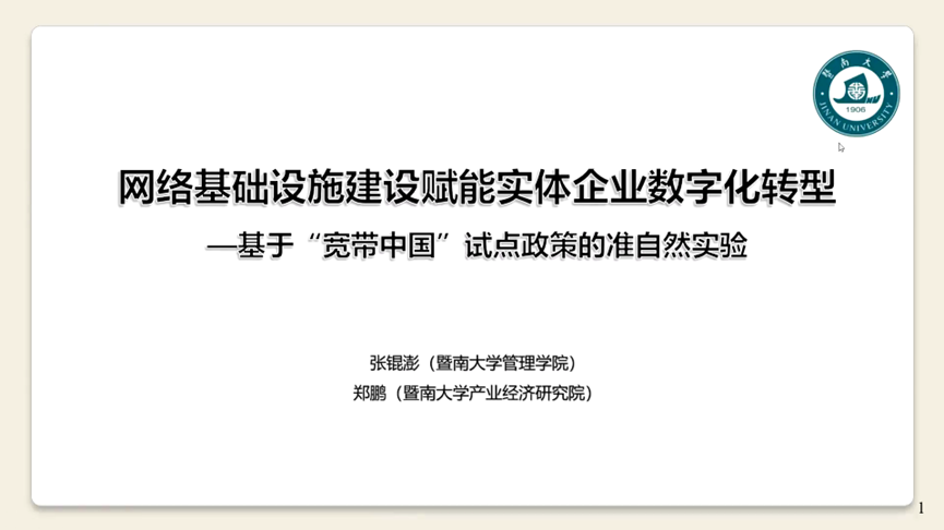 首先来自的暨南大学的张锟澎进行了题为《网络基础设施建设赋能实体企业数字化转型——基于“宽带中国”试点政策的准自然实验》的论文汇报。建设数字信息基础设施,促进产业数字化转型是实现中国经济高质量发展的重要举措。本文以“宽带中国”战略作为准自然实验,并采用文本分析的方法,从企业数字化认知、资产和创新三个方面构建了企业层面的数字化转型指标,研究了网络基础额设施建设对企业数字化转型的影响。研究发现,“宽带中国”战略能够显著促进企业数字化转型。机制研究发现,“宽带中国”通过促进企业资本和研发投入、改善劳动力结构以及提高人力资本投资的方式,推动了企业数字化转型。异质性方面,网络基础设施建设主要提升了大规模、高成长、非国有以及低融资约束企业的数字化水平;高管团队的职业异质性、高发展水平的要素市场和数字金融提高了网络基础设施建设对企业数字化转型的促进作用;而高管短视主义削弱了网络基础设施建设对企业数字化转型的促进作用。最后,本文发现,“宽带中国”通过推动企业数字化转型进而提升了企业生产效率和企业价值。