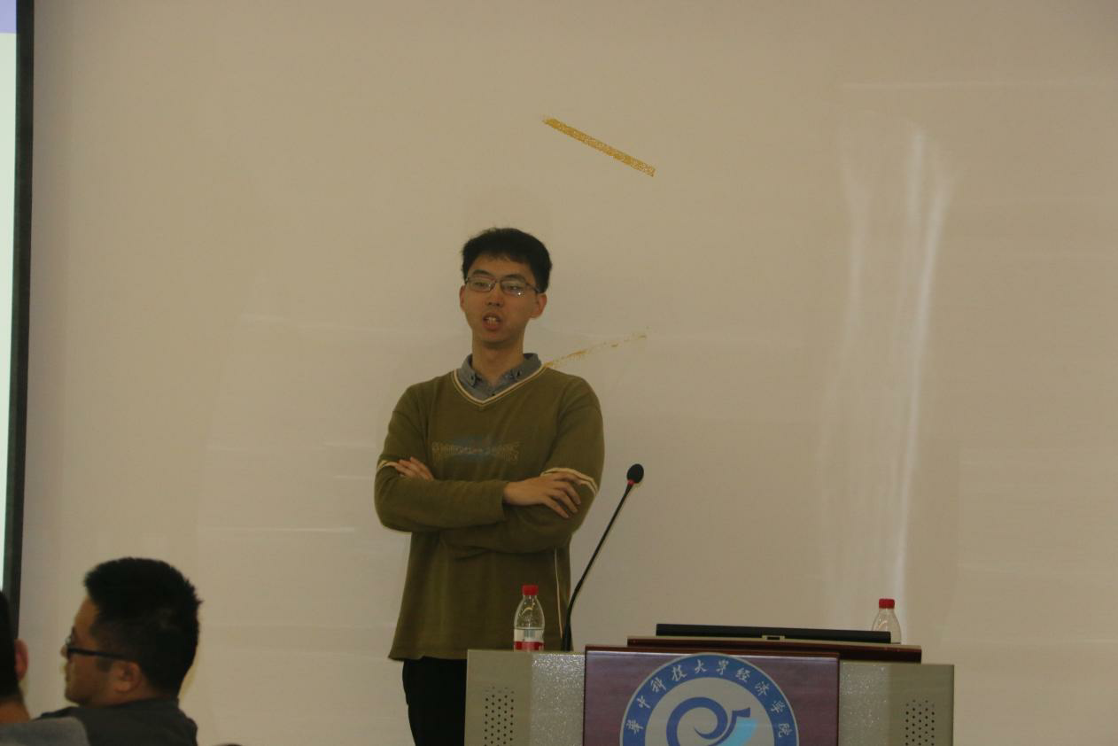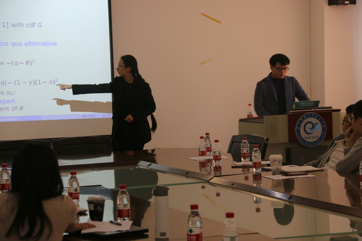 武汉大学经济与管理公司数理经济与数理金融系胡枭骁老师和湖南大学经济与贸易公司经济学系雷浩然老师进行联合汇报,他们的汇报题目为《Delegating lotteries: the optimality of veto-based delegation》。