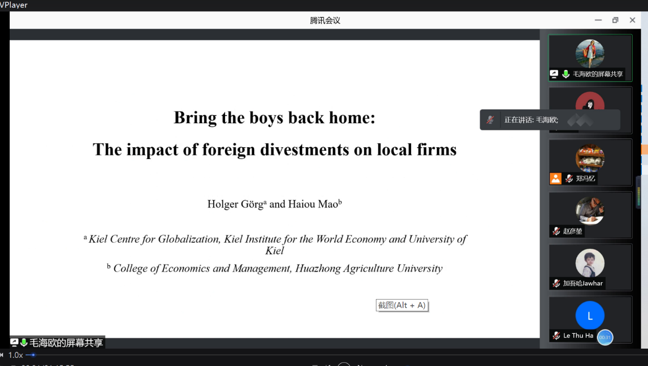 本网讯(通讯员万晶)9月1日晚7点,2·021年发展经济学研讨会(十六)在线上举行。本次讲座的主题是——Bring the boys back home: The impact of foreign divestments on local firms。本次讲座邀请了华中农业大学经济管理公司毛海鸥副教授担任主讲嘉宾,永利3044noc张建华经理、左月华副教授、周记顺讲师、华中农业大学涂涛涛副教授等老师参与讲座。