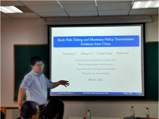 本网讯(通讯员崔娅鹃)2021年5月20日下午16:00,2·021年第十二次学术讲座会议在公司521会议室顺利举行。本次讲座邀请了中央财经大学金融公司副教授、丝路金融研究中心(教育部国别与区域研究基地)执行主任、金融公司学术交流部主任、金融科技系书记、全国金融系统青年联合会第三届委员会委员(金融科技界别)彭俞超老师担任主讲嘉宾,他以“BANK RISK-TAKING AND MONETARY POLICY TRANSMISSION: EVIDENCE FROM CHINA”为主题进行了演讲,公司20余名师生共同参加了此次讲座,积极地同彭俞超老师进行了学术讨论。