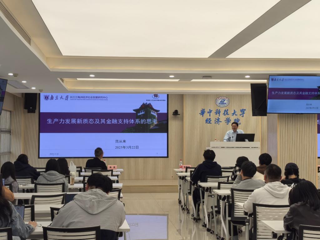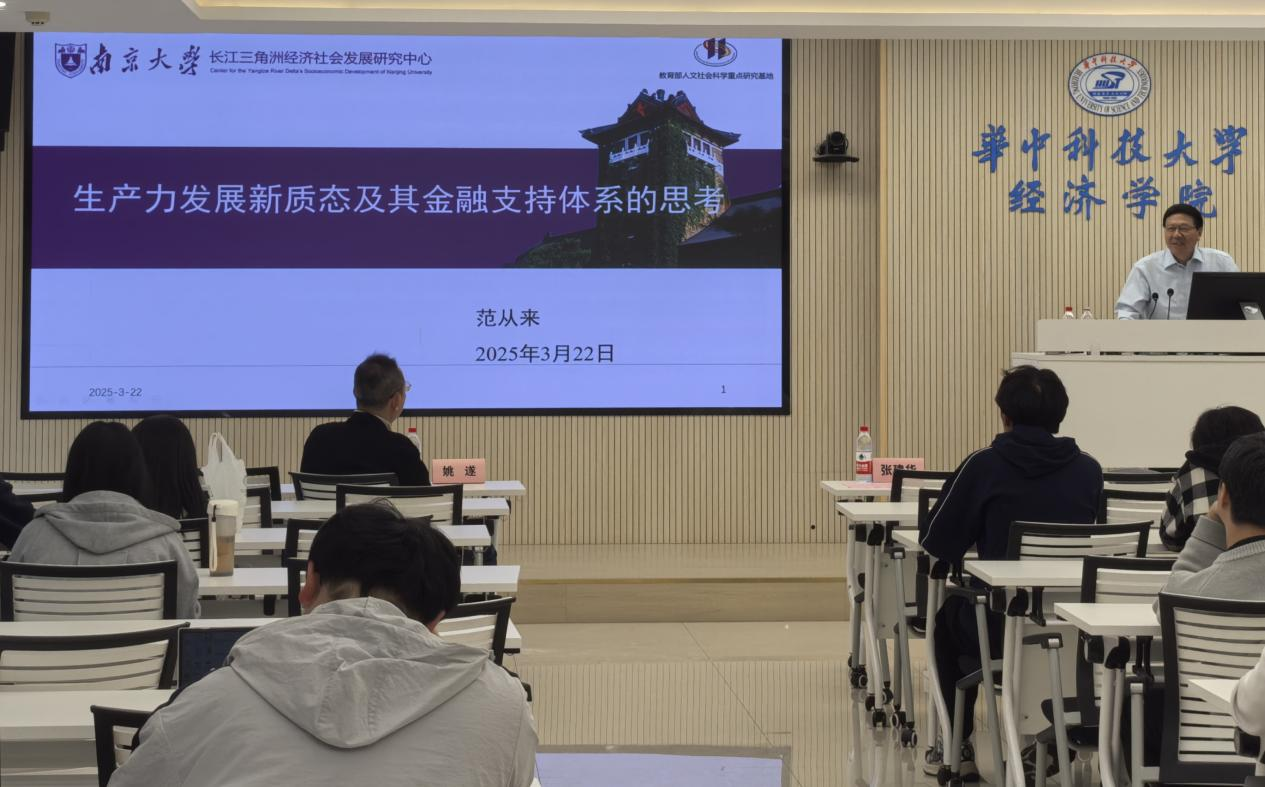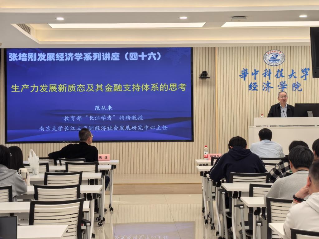 本网讯(通讯员:王媛琪 郝思怡)2025年3月22日下午,张培刚发展经济学系列讲座(四十六)在公司109教室顺利举行。此次讲座邀请了国家级人才称号获得者、教育部人文社会科学重点研究基地南京大学长江三角洲经济社会发展研究中心主任范从来教授,主讲题为“生产力发展新质态及其金融支持体系的思考”的学术报告。本次讲座由公司经理张建华教授主持。