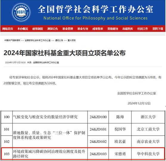 本网讯(通讯员:梁盈盈)2024年12月12日,全国哲学社会科学工作办公室公布2024年度国家社科基金重大项目的立项名单。永利3044noc宋德勇教授作为首席专家申报的《环境政策减污降碳协同治理效应测度及提升路径研究》项目(项目批准号:24&ZD103)荣获国家社科基金重大项目资助。这是宋德勇教授继2018年作为首席专家首次获批国家社科基金重大项目后,在承担国家级课题方面的又一重大突破。